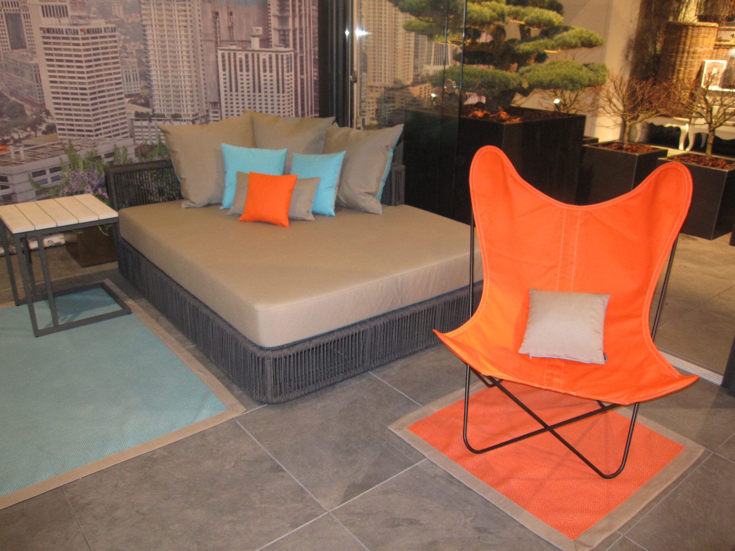 Wetterfester, flüssigkeits und schmutzabweisender outdoor Teppich im Format 80 x 80cm (passende Grösse um darauf einen outdoor Butterfly Chair zu platzieren). Kann aufgrund seiner flüssigkeitsabweisenden Eigenschaften auch für pflegeleichtes Wohnen indoor eingesetzt werden.